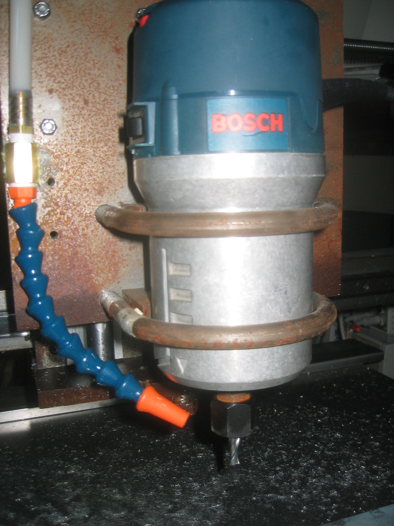The motors have received an upgrade and the home made delrin couplings have been replaced with some very nice helical couplings. I have installed a liquid chip removal and cooling system. The chip removal system also does a good job of keeping aluminum shavings from flying all over the place.